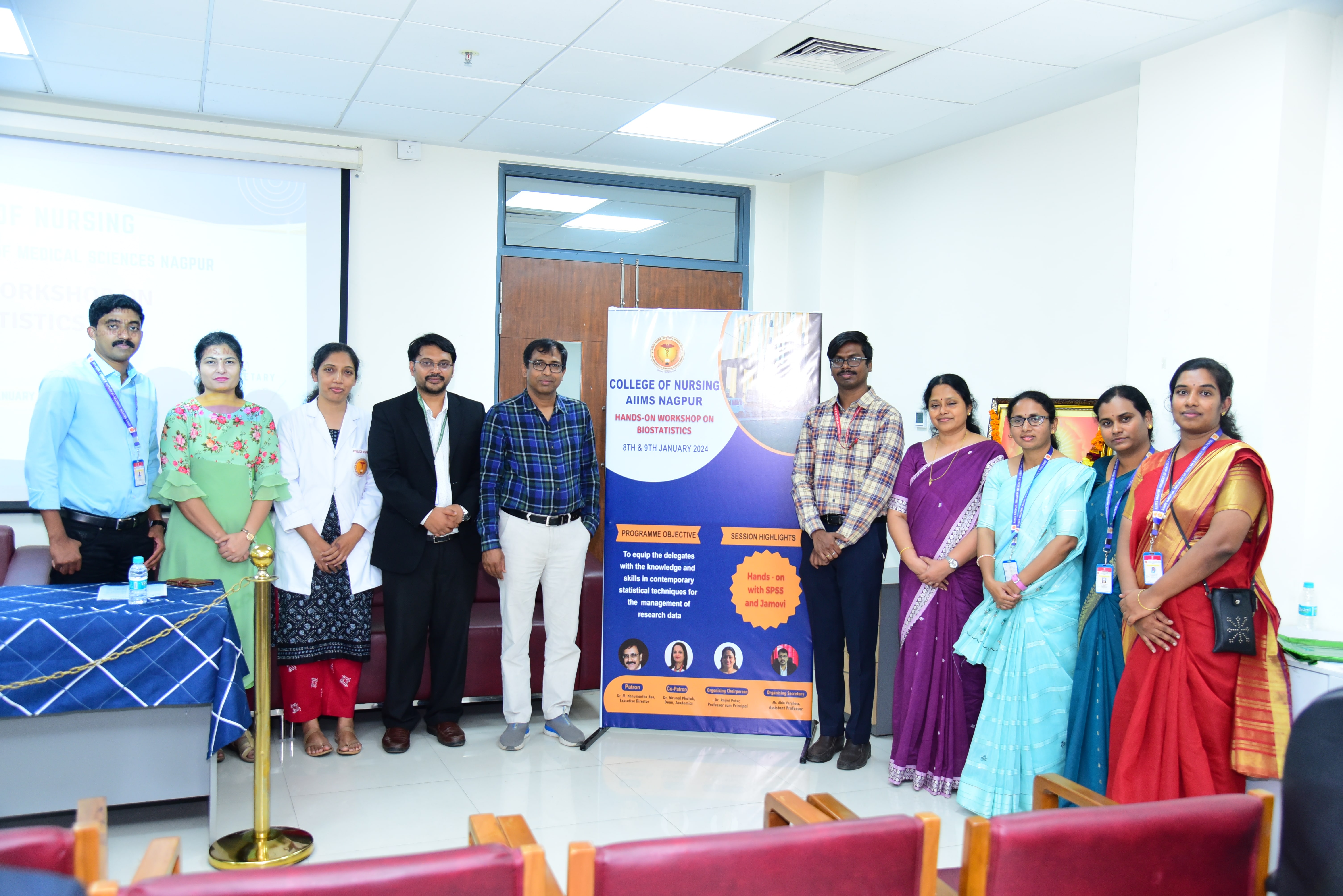 • The College of Nursing, AIIMS Nagpur organized the first national workshop on January 8th and 9th, 2024 followed by a short course on "Research Essentials" from 10-14 January, 2024. Ms. Gigni George, Ms. Komathi, Ms. Usha Chakali, and Mr. Aljo Joy, faculty of the Nursing college, made up the organising committee, along with Chairperson, Dr. Rajini Peter, Professor cum Principal and organizing secretary, Mr. Abin Varghese, Assistant professor, College of Nursing.