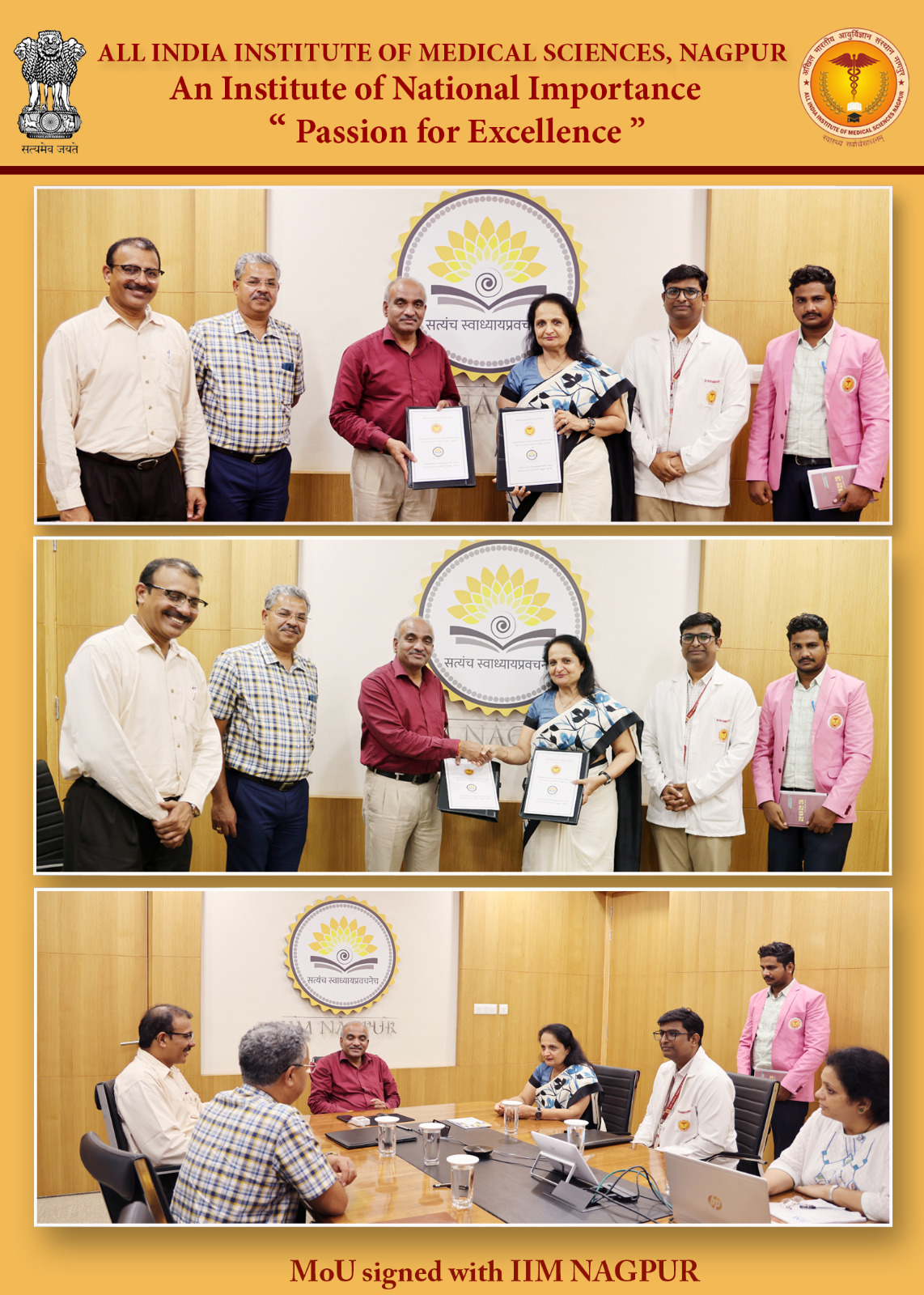 •  Nagpur: Adding yet another academic accolade to its list, Indian Institute of Management, Nagpur (IIM-N) has signed first of its kind of MoU with All India Institute of Medical Sciences (AIIMS), Nagpur, on Monday to establish fruitful means to exchange knowledge, information and research.