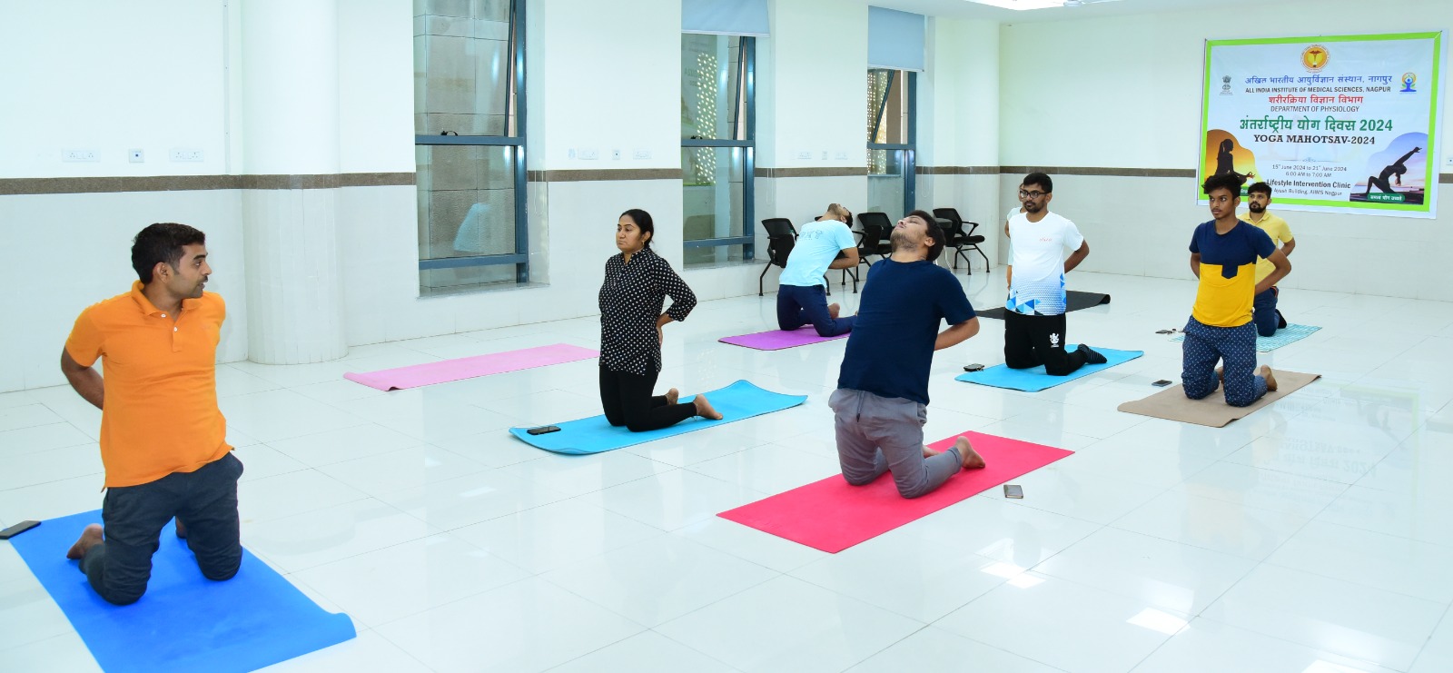 • In observance of International Day of Yoga 2024, AIIMS Nagpur is observing Yoga Week under the guidance of Executive Director Prof. P. P. Joshi   Daily Yoga sessions will be conducted for faculty and students to promote health and well-being by the Lifestyle Intervention Clinic of the Department of Physiology.