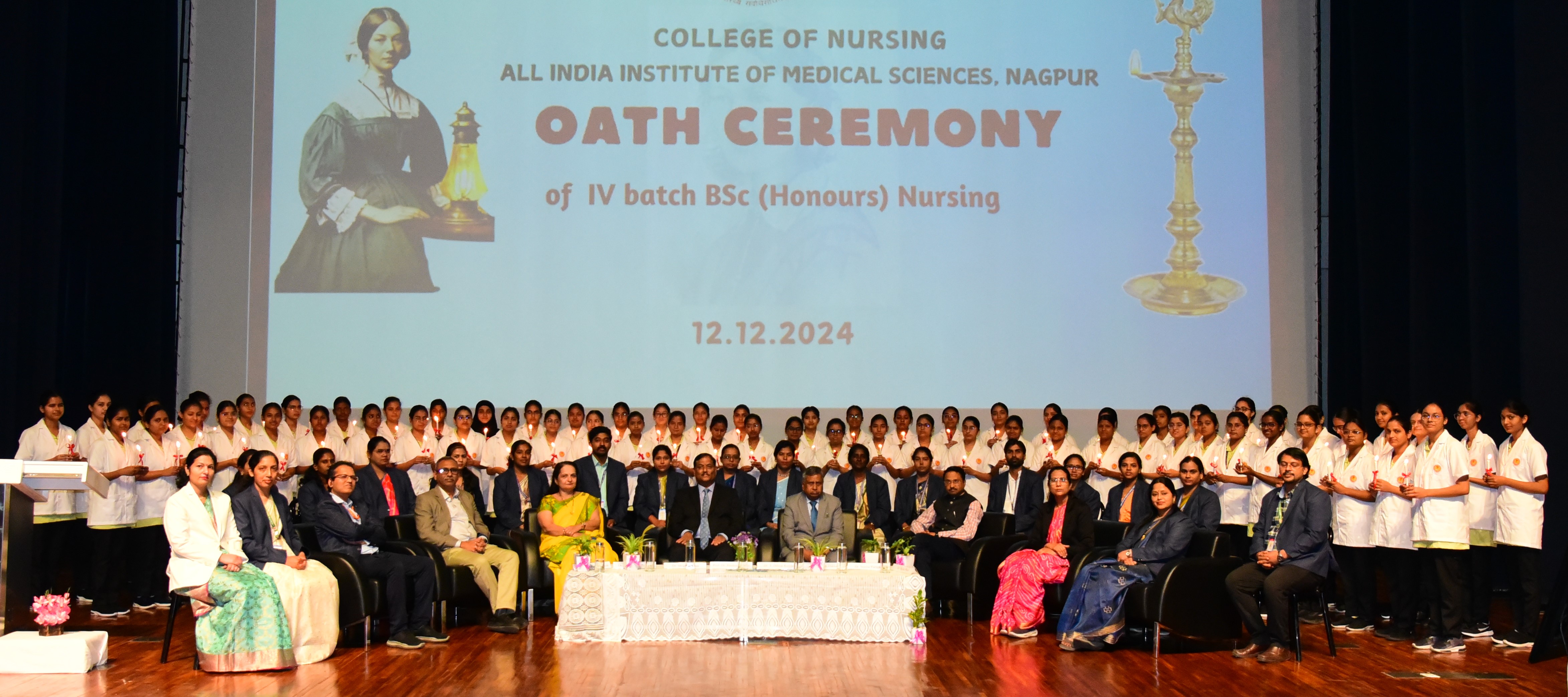 • The Oath ceremony of fourth batch (2024) BSc Honours Nursing students of College of Nursing, AIIMS Nagpur was held on 12th December 2024. Dr. T. Dileep Kumar President, Indian Nursing Council was the Chief Guest. The ceremony began with the lighting of the ceremonial lamp by the chief guest, Prof. Dr PP Joshi (Executive Director & CEO), Dr Mrunal Phatak, Dean Academics, Dr Ganesh Dakhle, Dean examinations, Dr Pradeep Deshmukh, Dean Research, Dr Seema Parvekar, Medical Superinte...