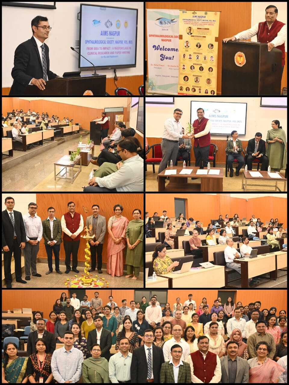 The Department of Ophthalmology, AIIMS Nagpur, in collaboration with the Maharashtra Ophthalmological Society (MOS), Vidarbha Ophthalmic Society (VOS), and Ophthalmological Society of India (OSN), successfully organised a one-day workshop titled "FROM IDEA TO IMPACT: A MASTERCLASS IN CLINICAL RESEARCH AND PAPER WRITING – For PGs and